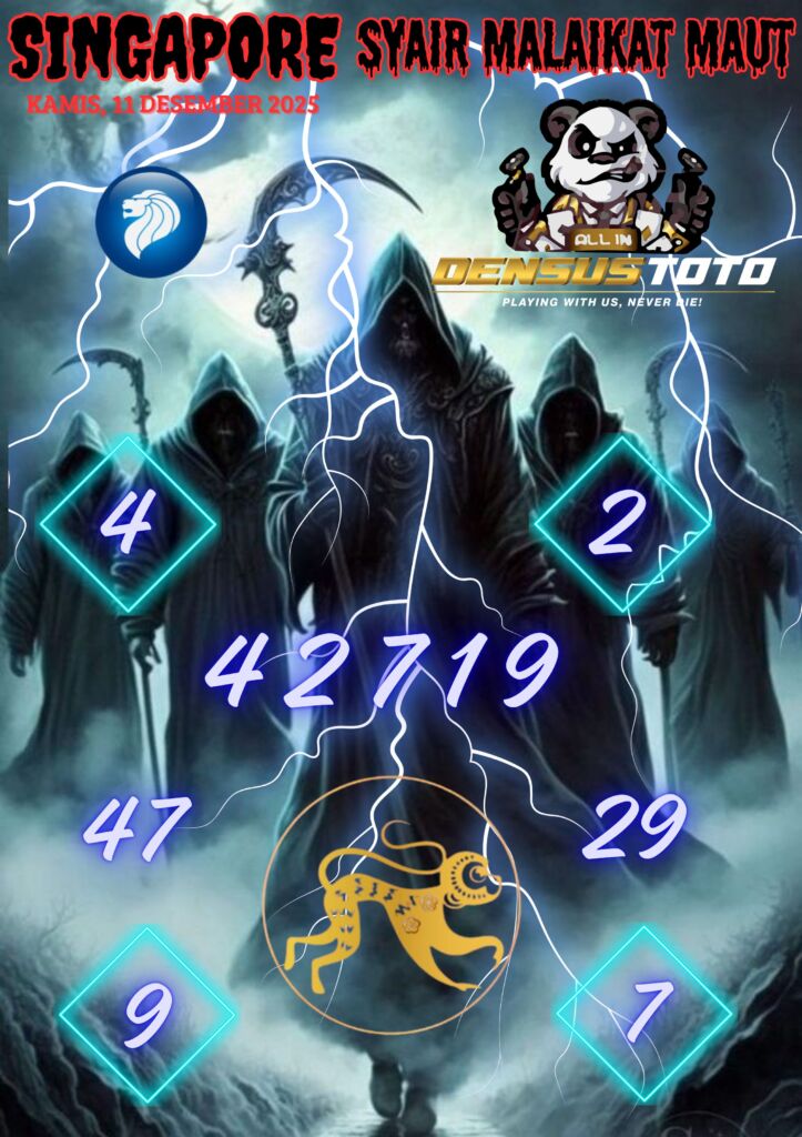 Prediksi DENSUSTOTO menyediakan Syair Togel Singapore resmi yang dapat anda saksikan dalam situs judi togel online ini. Setiap pemain judi togel online yang tidak memandang dan mengenal syair togel singapore pastilah kurang mujur buat mendapati angka keluaran togel terjitu. Lantaran itu sekarang situs judi togel online DENSUS TOTO sekarang akan memberikan anda bocoran bagaimana caranya mendapati nomor keluaran prediksi singapore dari syair togel sgp terjitu. Sekarang anda cuma perlu dan mengenal code syair singapore ini merupakan prediksi singapore yang dituang terdapat sifat code syair. Maka serius tidak bertanya-tanya jikalau sejumlah penggemar togel begitu menyintai prediksi syair togel ini. Buat prediksi syair singapore dapat dipakai buat bahan ketidaksamaan mencari angka jitu yang bisa keluar pada hari ini. Karenanya berhati-hatilah selalu pada setiap terdapat dipicu di situ dapat anda angka bermain 2D, 3D dan 4D