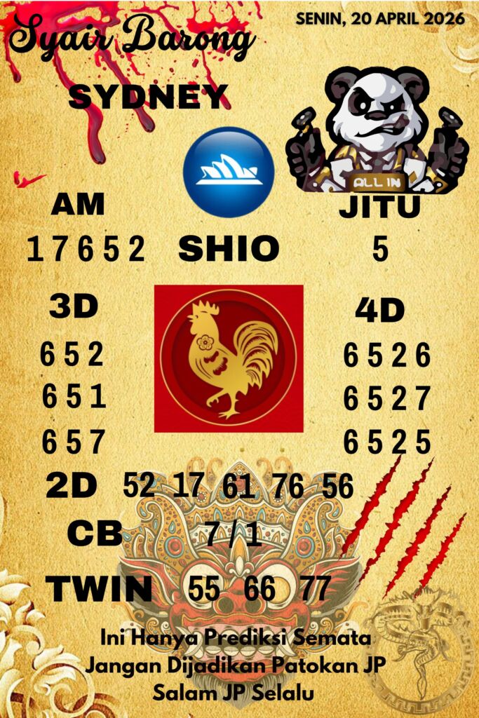 Prediksi DENSUSTOTO menyediakan Syair Togel Sydney resmi yang dapat anda saksikan dalam situs judi togel online ini. Setiap pemain judi togel online yang tidak memandang dan mengenal syair togel sydney pastilah kurang mujur buat mendapati angka keluaran togel terjitu. Lantaran itu sekarang situs judi togel online DENSUS TOTO sekarang akan memberikan anda bocoran bagaimana caranya mendapati nomor keluaran prediksi sydney dari syair togel sgp terjitu. Sekarang anda cuma perlu dan mengenal code syair sydney ini merupakan prediksi sydney yang dituang terdapat sifat code syair. Maka serius tidak bertanya-tanya jikalau sejumlah penggemar togel begitu menyintai prediksi syair togel ini. Buat prediksi syair sydney dapat dipakai buat bahan ketidaksamaan mencari angka jitu yang bisa keluar pada hari ini. Karenanya berhati-hatilah selalu pada setiap terdapat dipicu di situ dapat anda angka bermain 2D, 3D dan 4D