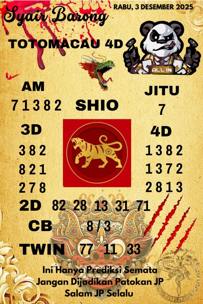Prediksi DENSUSTOTO menyediakan Syair Togel Toto Macau resmi yang dapat anda saksikan dalam situs judi togel online ini. Setiap pemain judi togel online yang tidak memandang dan mengenal syair togel Toto Macau pastilah kurang mujur buat mendapati angka keluaran togel terjitu. Lantaran itu sekarang situs judi togel online DENSUS TOTO sekarang akan memberikan anda bocoran bagaimana caranya mendapati nomor keluaran prediksi Toto Macau dari syair togel sgp terjitu. Sekarang anda cuma perlu dan mengenal code syair Toto Macau ini merupakan prediksi Toto Macau yang dituang terdapat sifat code syair. Maka serius tidak bertanya-tanya jikalau sejumlah penggemar togel begitu menyintai prediksi syair togel ini. Buat prediksi syair Toto Macau dapat dipakai buat bahan ketidaksamaan mencari angka jitu yang bisa keluar pada hari ini. Karenanya berhati-hatilah selalu pada setiap terdapat dipicu di situ dapat anda angka bermain 2D, 3D dan 4D.