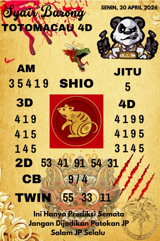Prediksi DENSUSTOTO menyediakan Syair Togel Toto Macau resmi yang dapat anda saksikan dalam situs judi togel online ini. Setiap pemain judi togel online yang tidak memandang dan mengenal syair togel Toto Macau pastilah kurang mujur buat mendapati angka keluaran togel terjitu. Lantaran itu sekarang situs judi togel online DENSUS TOTO sekarang akan memberikan anda bocoran bagaimana caranya mendapati nomor keluaran prediksi Toto Macau dari syair togel sgp terjitu. Sekarang anda cuma perlu dan mengenal code syair Toto Macau ini merupakan prediksi Toto Macau yang dituang terdapat sifat code syair. Maka serius tidak bertanya-tanya jikalau sejumlah penggemar togel begitu menyintai prediksi syair togel ini. Buat prediksi syair Toto Macau dapat dipakai buat bahan ketidaksamaan mencari angka jitu yang bisa keluar pada hari ini. Karenanya berhati-hatilah selalu pada setiap terdapat dipicu di situ dapat anda angka bermain 2D, 3D dan 4D.